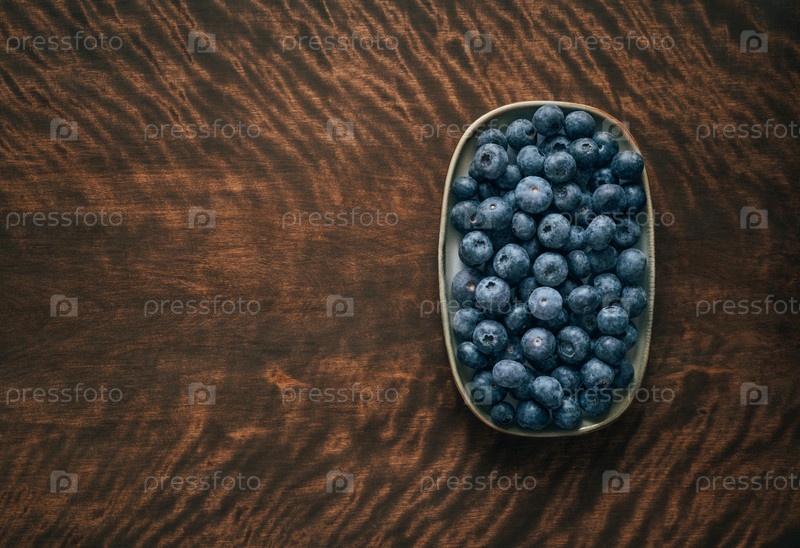 Свежая черника на деревянном фоне в овальной тарелке. Сочные спелые синие ягоды. Концепция органической здоровой пищи. Вид сверху, пространство для копирования