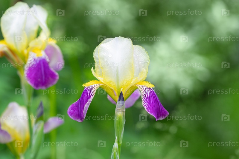 Цветок ириса на зеленом фоне крупным планом. Красивый цветок с белыми, фиолетовыми и желтыми лепестками