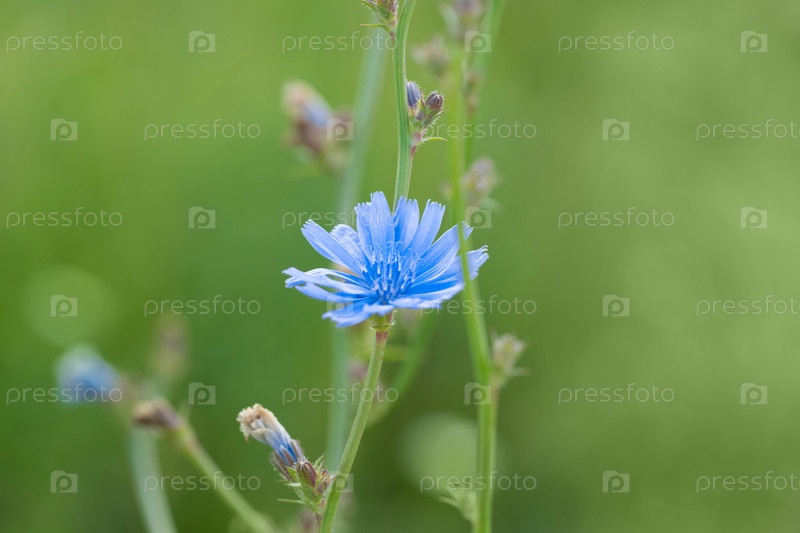 Синий цветок цикория на зеленом фоне. Здоровый заменитель кофе