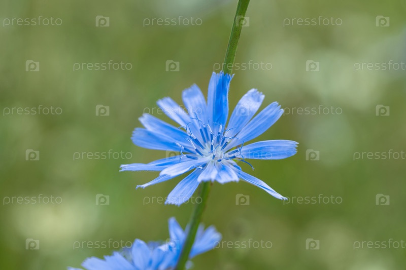 Голубой цветок цикория крупным планом на зеленом размытом фоне. Медицинское полезное растение