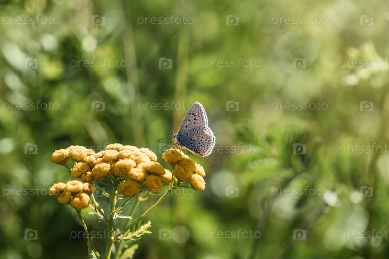 Медная бабочка сидит на желтом цветке пижмы на зеленом размытом фоне. Солнечный летний день. Макро, крупный план, вид сбоку