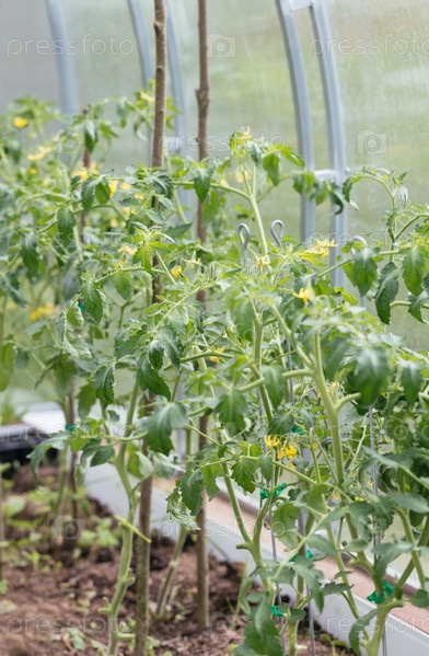 Кусты томатов в теплице. Органические натуральные овощи, выращенные в эко-саду. Растения в теплице