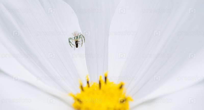 Краб-паук, misumena vatia с добычей в крупном плане на фоне белого цветка