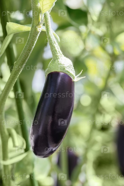 Спелый баклажан на зеленом кусте крупным планом. Натуральные органические овощи, выращенные в теплице и огороде