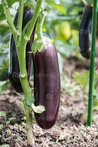 Фиолетовый спелый баклажан, выращенный в теплице крупным планом. Натуральные домашние овощи