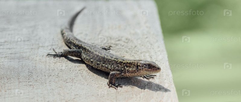 Ящерица Zootoca vivipara греется на солнце.Обычная ящерица или живородящая ящерица на старой деревянной доске в крупном плане