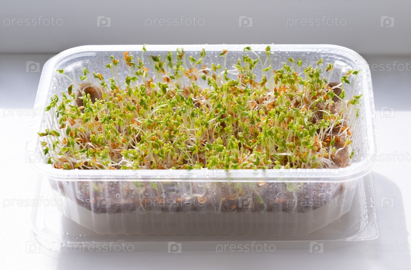 Микрозелень, выращенная в контейнере дома на подоконнике. Молодые ростки кресс-салата. Домашний сад