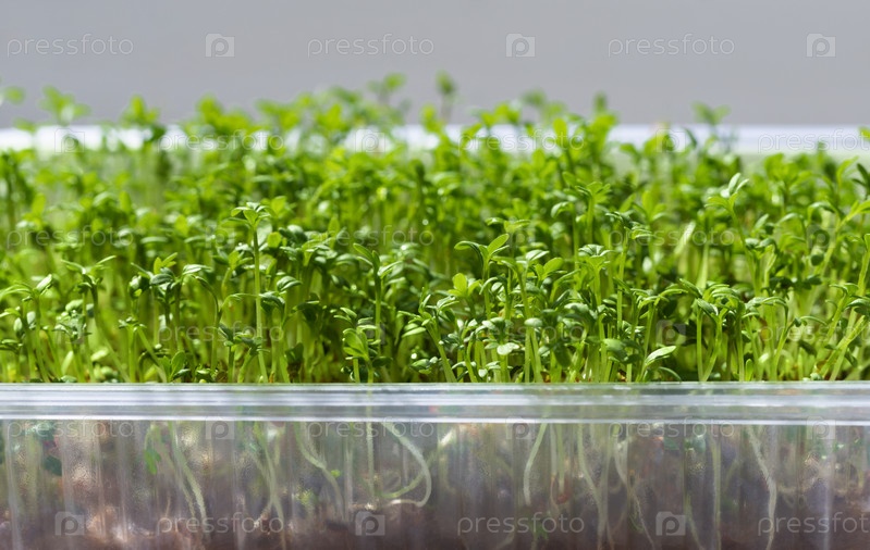 Свежие ростки кресс-салата или микрозелень. Пророщенные семена фон крупным планом