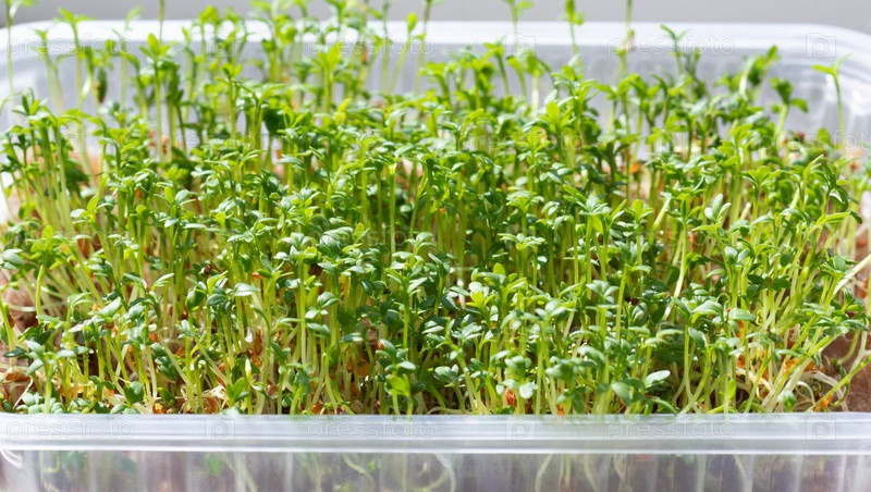 Микрозелень крупным планом. Молодые проросшие семена кресс-салата, выращенные в контейнере. Здоровая пища