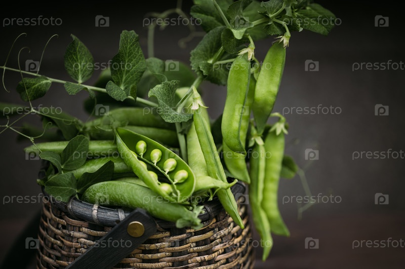 Крупный план зеленого горошка с листьями и стручками в корзине. Веганская и вегетарианская еда