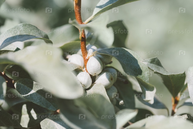 Серебряные ягоды и листья крупным планом. Серебрянка, крольчатника, волчья ива, коммутата, декоративный кустарник лох