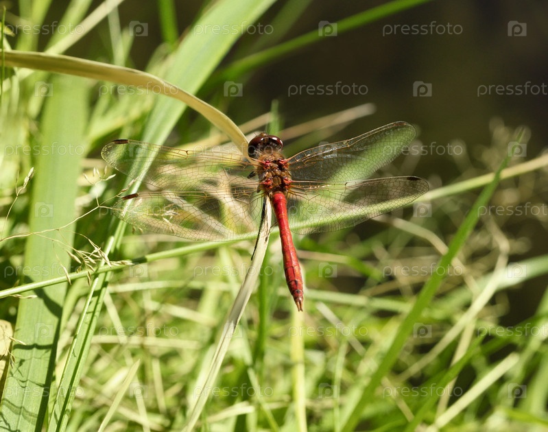 Красивая красная стрекоза Sympetrum sanguineum на зеленом фоне в крупном плане