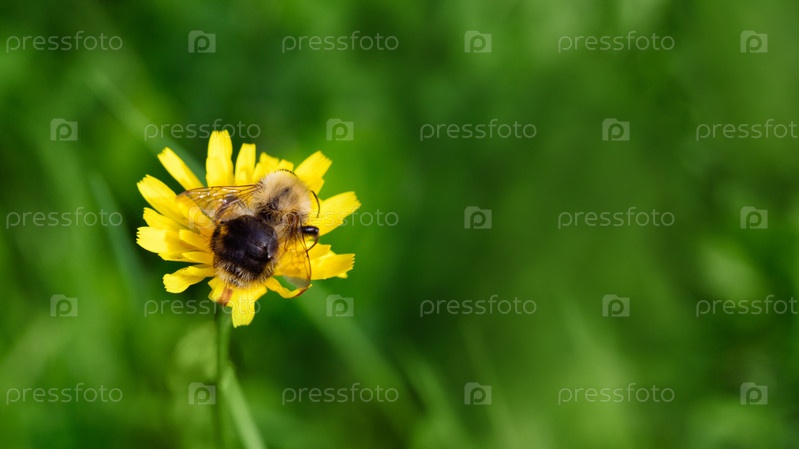 Большой черный шмель с желтыми полосками и текстурированными крыльями на желтом цветке осеннего бражника