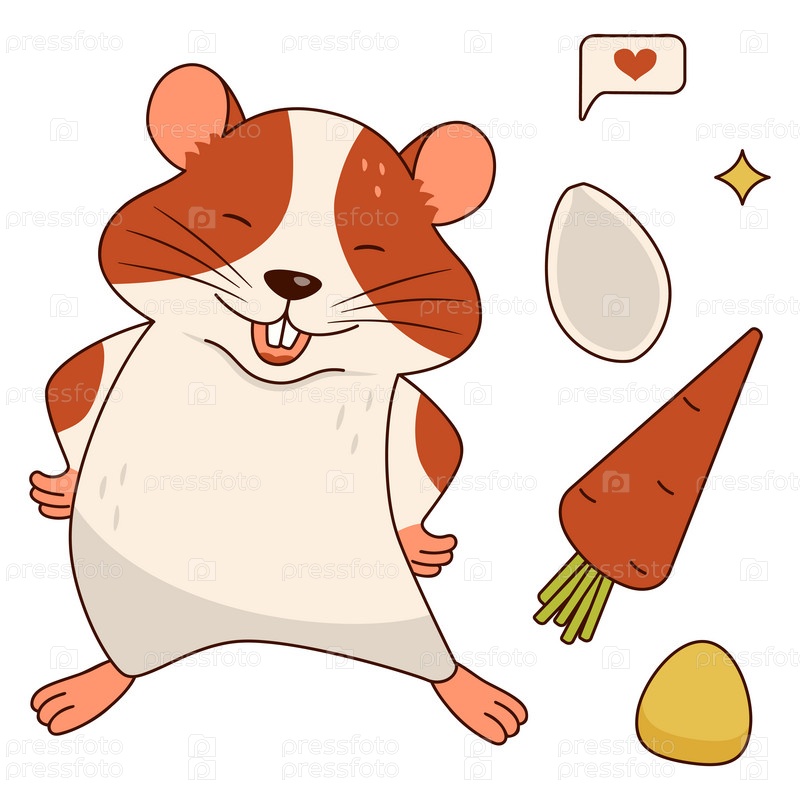 Милый оранжево-белый хомяк, морковь, кукурузное зерно, тыквенное семя, смс. Изолировано на белом фоне