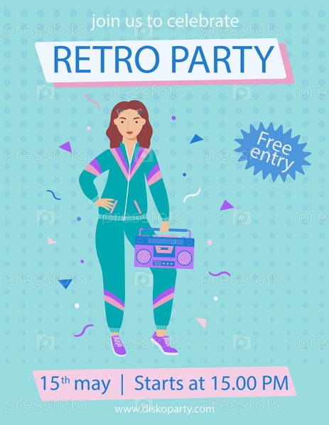 Плакат формата А4 с девушкой в спортивном костюме с магнитофоном в ретро-стиле