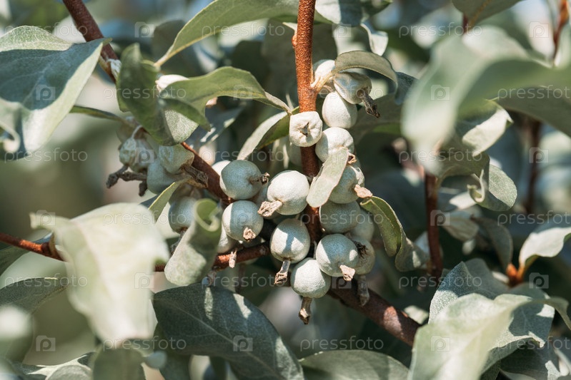 Ветка с серебристыми ягодами и листьями куста волчьей ивы крупным планом. Серебрянка, крольчатника, лох коммутата на заднем плане