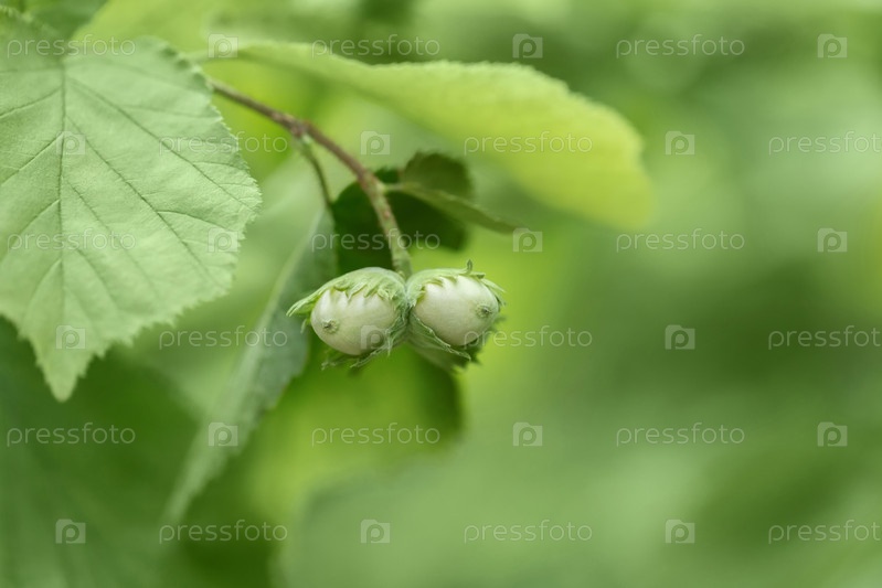 Фундук на ветке крупным планом. Зеленые орехи на орешнике в лесу. Красивый природный фон