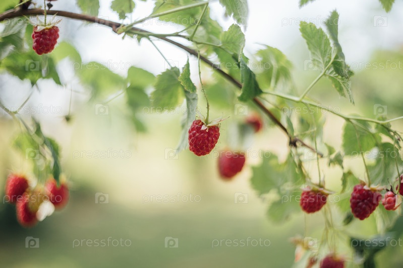 Красивая сочная красная малина на ветке на зеленом фоне. Лесной малиновый летний фон