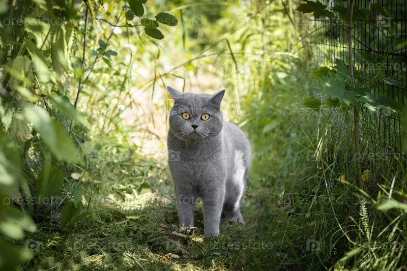 Смешной удивленный серый кот в природе. Британский милый кот с ярко-оранжевыми глазами в зеленой траве. Питомец гуляет