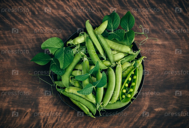 Свежий зеленый горошек в тарелке на деревянном фоне. Горошек с зелеными стручками и листьями. Вид сверху, плоская планировка