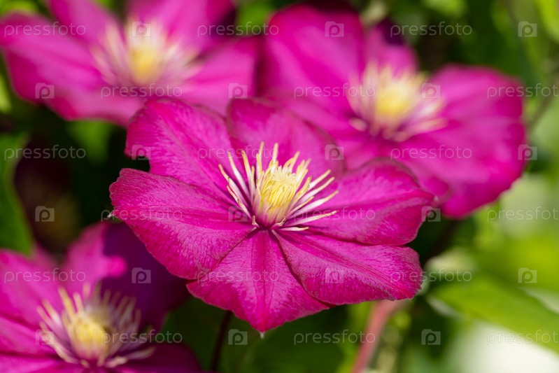 Клематис Виль де Лион розовый цветок на зеленом фоне крупным планом. Садовые вьющиеся цветы с желтыми тычинками