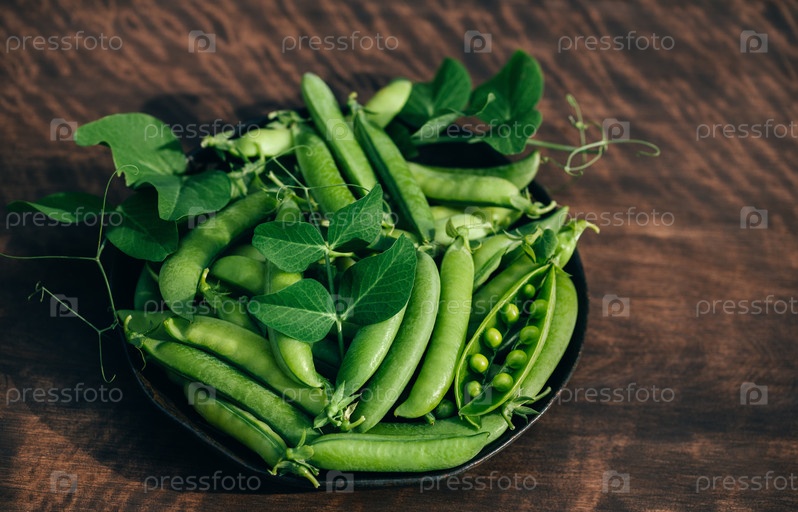 Зеленый горошек в миске на деревянном фоне крупным планом. Стручки зеленого горошка и листья. Здоровая пища