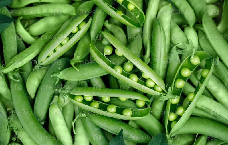 Свежий зеленый горошек фон. Стручки зеленого горошка крупным планом. Вид сверху, плоская планировка