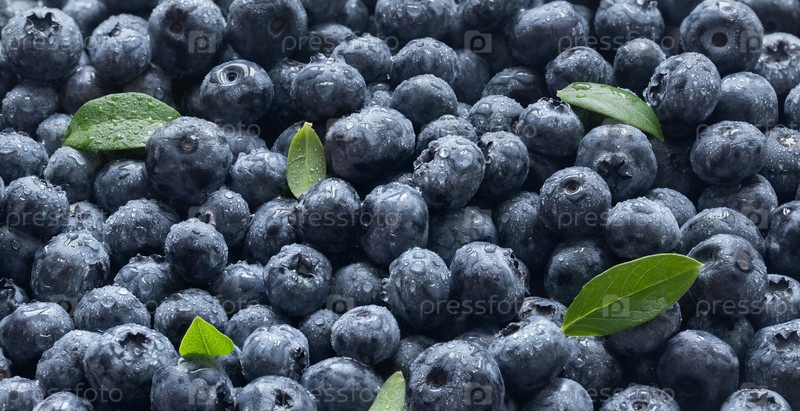 Свежая черника в каплях воды и фоне зеленых листьев. Текстура или узор ягоды черники. Баннер. Черника, голубика