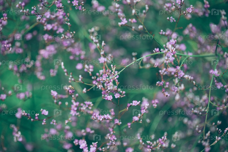 Маленькие фиолетовые цветы лимониума на зеленом фоне. Цветочный фон