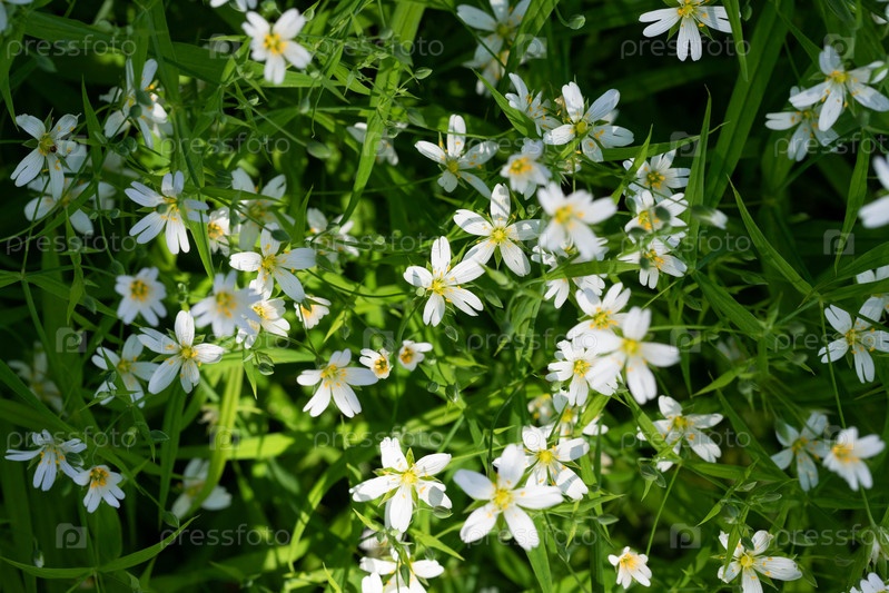 Звездчатка холостеа или звездчатка или звездчатка на зеленом фоне. Белый полевой цветок
