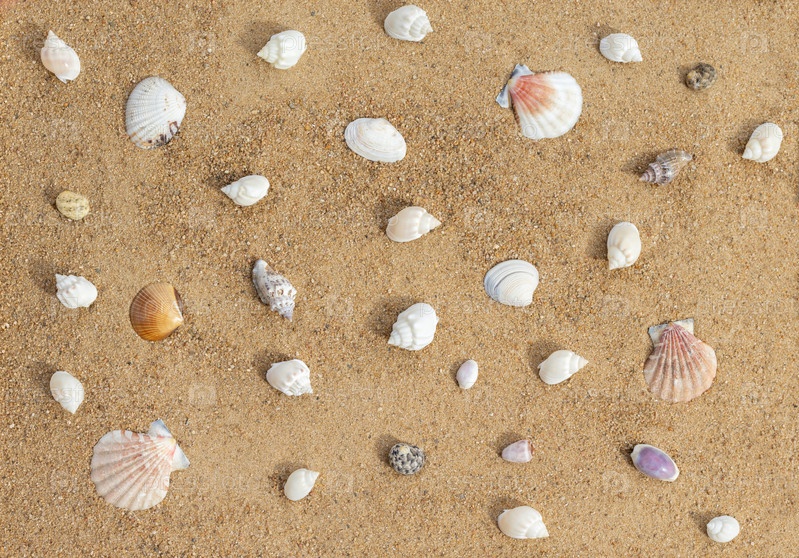 Красивые ракушки на песчаном пляже. Ракушки на фоне песка. Вид сверху, плоская планировка