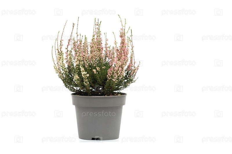 Розовый вереск в цветочном горшке, изолированном на белом фоне. Вереск или шиповник или обыкновенный вереск. Копировать пространство