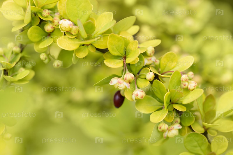 Цветущий барбарис тунберга ауреа зеленый фон. Декоративный барбарис с желтыми листьями кустарник крупным планом