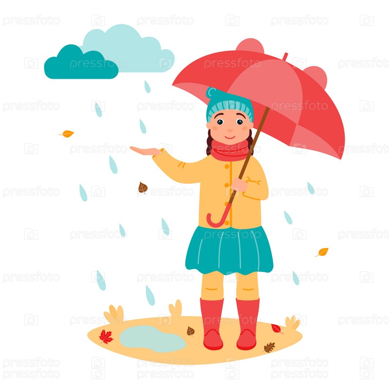Счастливая девочка под зонтиком в осенней одежде ловит капли дождя. Листопад. Дождь
