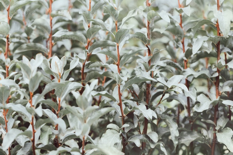 Красивый фон или текстура серебристых листьев. Серебряная ягода, кролик, куст садовой ивы волчьей. Садовый декоративный кустарник elaeagnus commutata