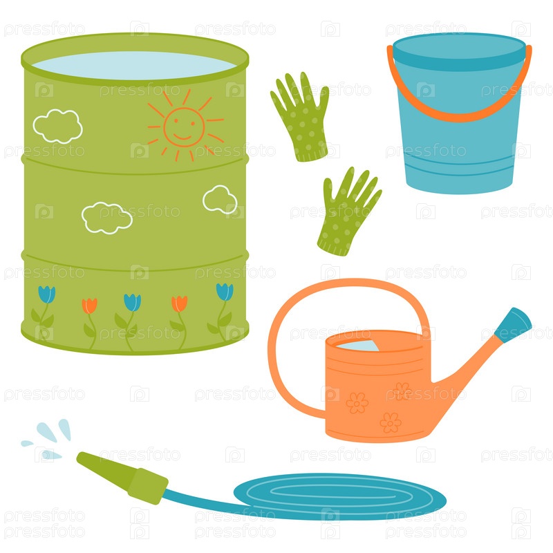 Набор для полива растений - ведро, шланг, бочка с водой, лейка, перчатки. Садоводство, фермерство