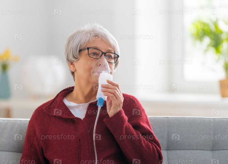 Пожилая женщина использует ингалятор для лечения астмы
