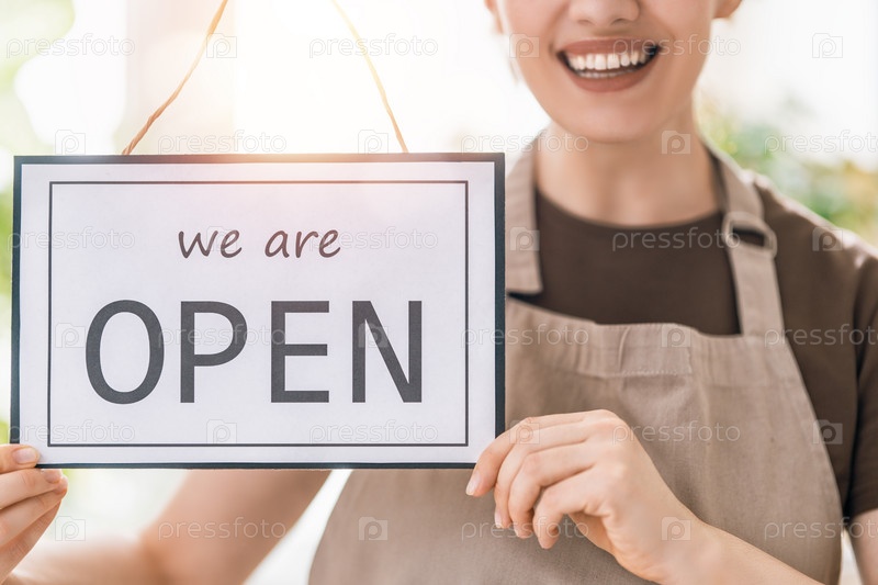Владелец бизнеса держит табличку с объявлением об открытии