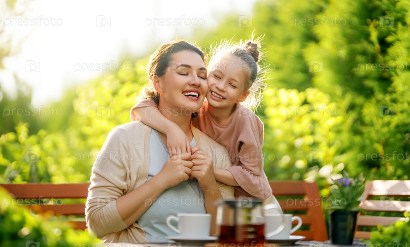 Семья пьет чай в саду