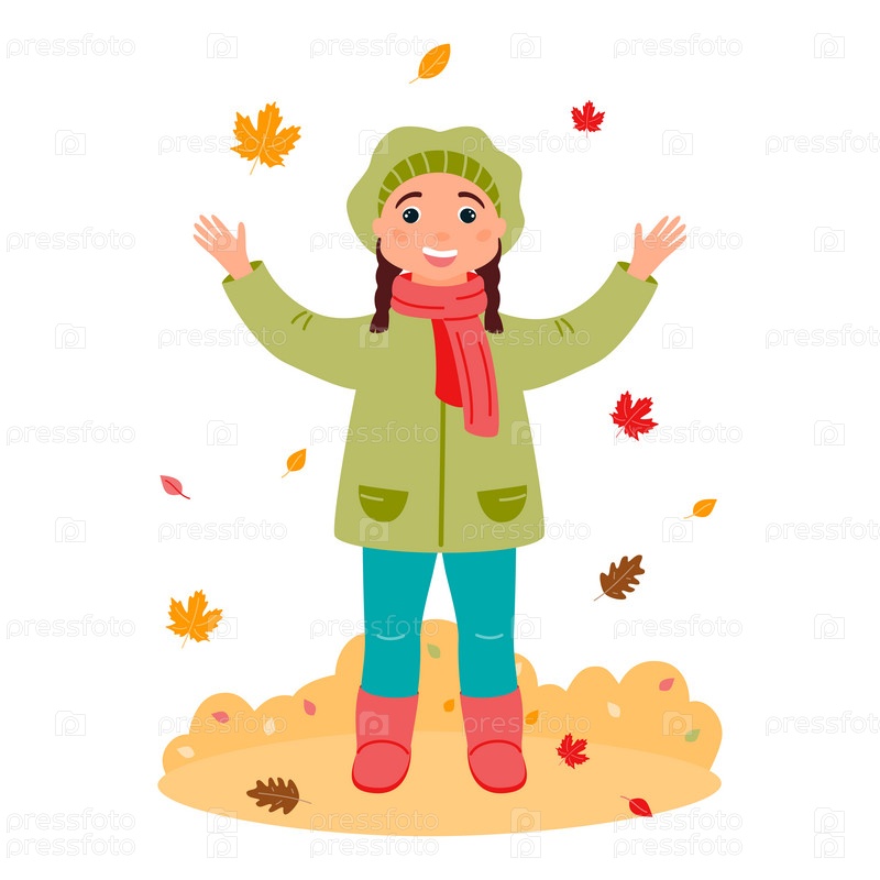Счастливая девочка в осенней одежде ловит падающие разноцветные листья. Листопад. Осенний сезон