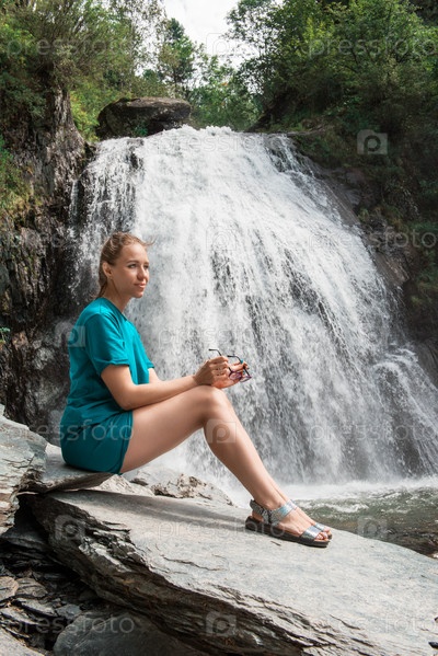 Женщина у водопада Корбу на Телецком озере осенью в Горном Алтае