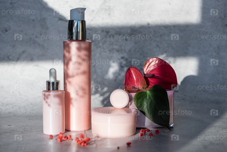 Косметические средства для макияжа на сером фоне с реальными тенями от окна