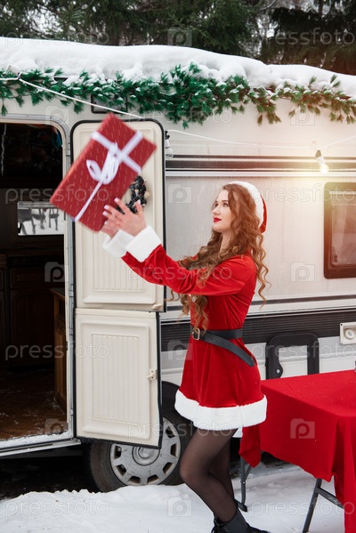Красавица в костюме Санты в зимнем кемпинге