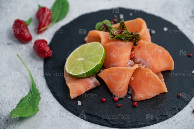 Свежие ломтики лосося с перцем, зеленью и лаймом на бетонном фоне