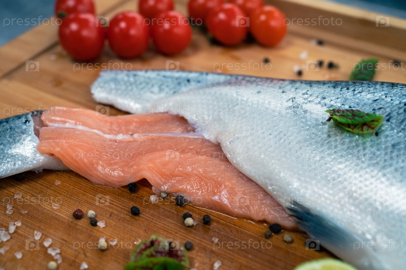 Свежая сырая рыба лосось на кухонной деревянной доске со специями и лаймом