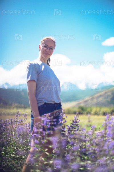 Счастливая молодая женщина в красивом поле диких розовых и фиолетовых цветов в летних горах Алтая