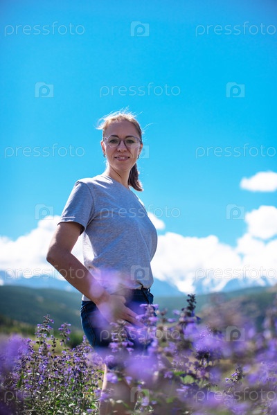 Счастливая молодая женщина в красивом поле диких розовых и фиолетовых цветов в летних горах Алтая