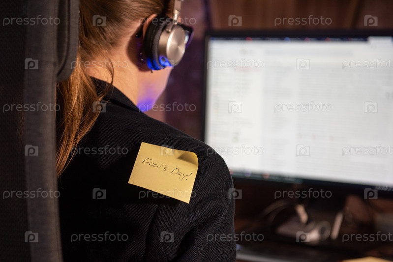 Наклеивание наклейки «День смеха» на плечо женщины, занятой работой на компьютере — концепция празднования Дня смеха