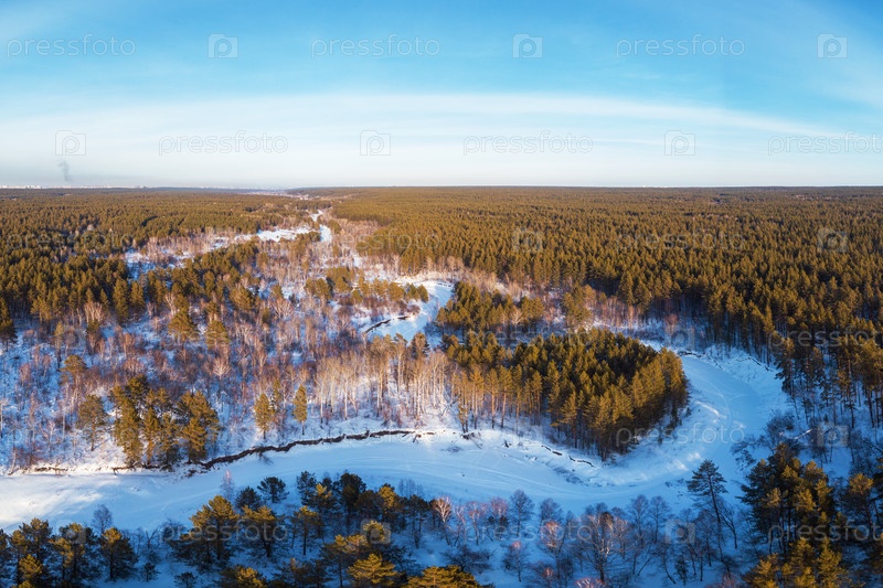 Вид с воздуха на зимний лес в форме сердца с замерзшей рекой