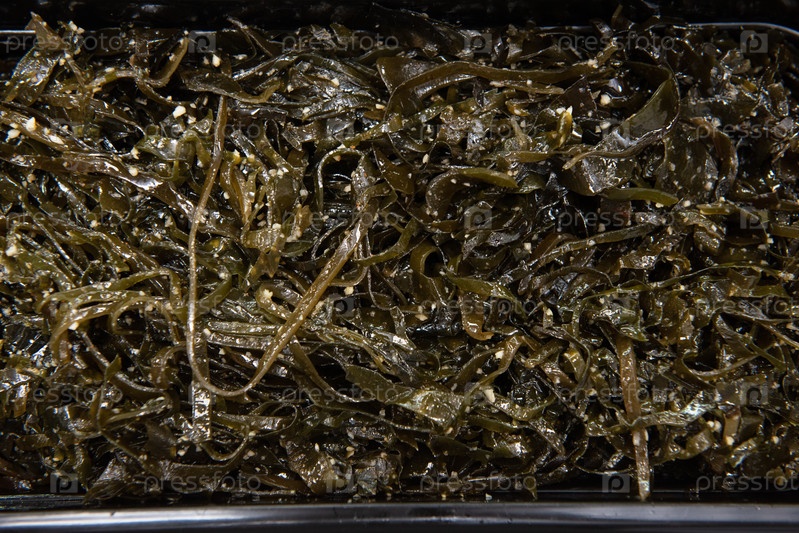 Салат из водорослей чука вакаме ламинария в пластиковых мисках. Концепция производства здоровой пищи или доставки еды